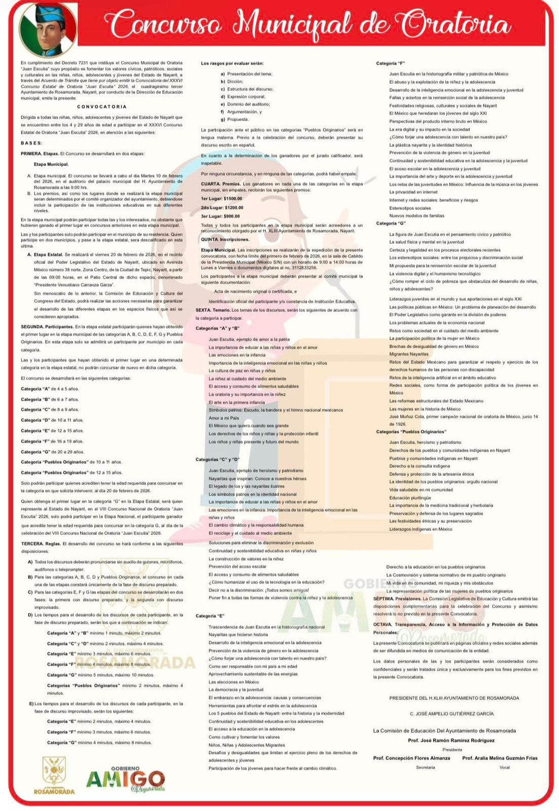 El Ayuntamiento de Rosamorada, bajo la dirección del Presidente Municipal Ampelio Gutiérrez, invita a niñas, niños, adolescentes y jóvenes de 4 a 29 años a participar en la etapa municipal del XXXVI Concurso Estatal de Oratoria “Juan Escutia” 2026. El evento se realizará el martes 10 de febrero a las 9:00 a.m. en el Auditorio del Palacio Municipal.