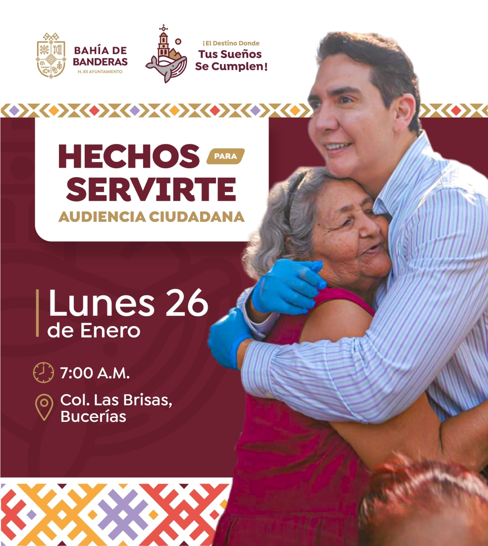 El Gobierno Municipal de Bahía de Banderas invita a la ciudadanía a participar en la próxima Audiencia Ciudadana, que será encabezada por el presidente municipal Héctor Santana, misma que se llevará a cabo este próximo lunes 26 de enero, en punto de las 7:00 a.m, en la colonia Las Brisas, en el poblado de Bucerías.