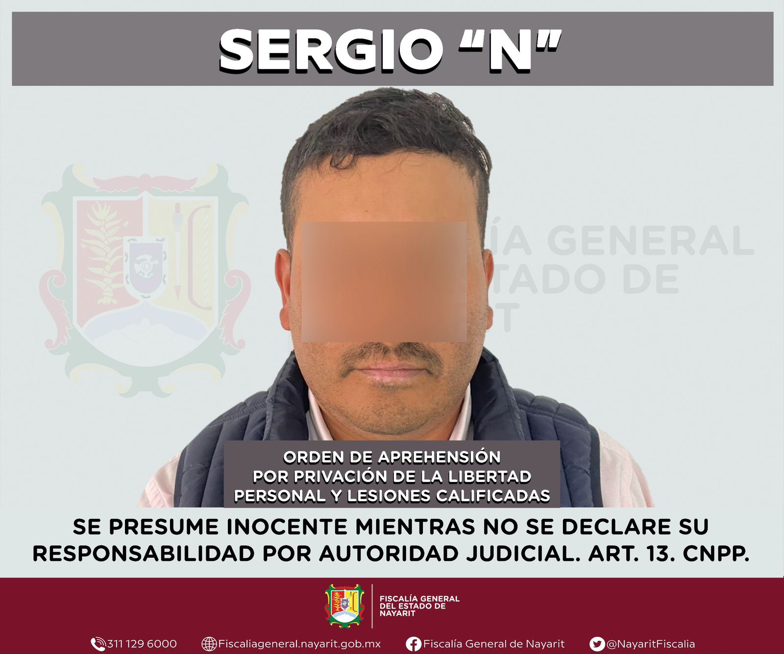 Elementos de la Agencia de Investigación Criminal de Nayarit ejecutaron una 0rd3n d3 4pr3h3ns10n en la localidad El Limón, municipio de Santa María del Oro, contra Sergio “N”, por su presumible participación en hechos que la ley señala como d3l1t0s de pr1v4c10n d3 l4 l1b3rt4d p3rs0n4l y l3s10n3s c4l1f1c4d4s, cometidos en agravio de una persona de sexo masculino cuya identidad se mantiene reservada para salvaguardar su privacidad e integridad.