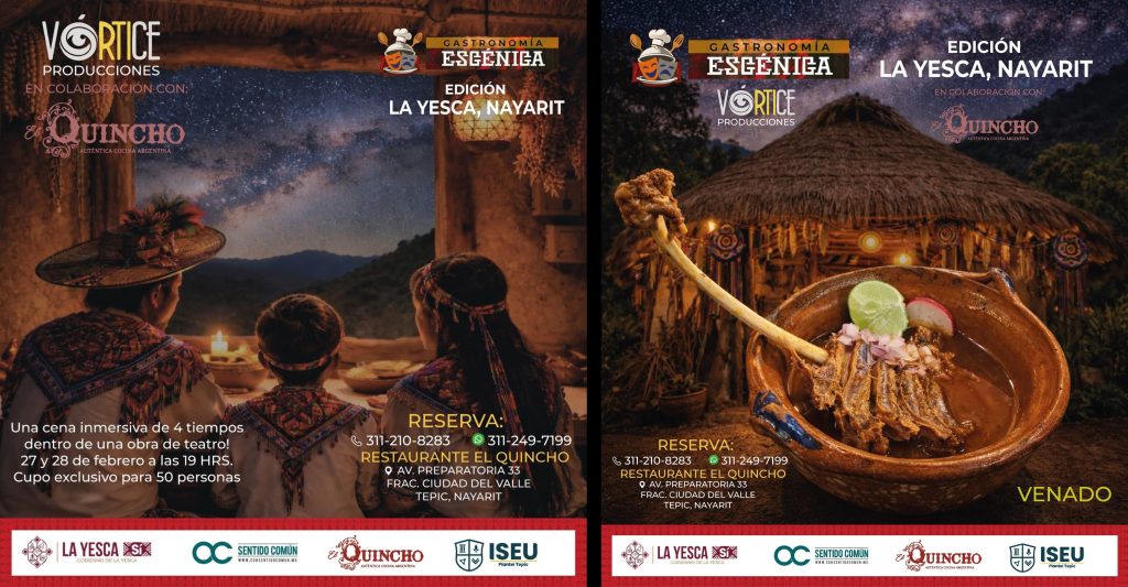 “Gastronomía Escénica” es una puesta en escena dentro de una cena de cuatro tiempos: un menú elaborado con ingredientes 100 por ciento nayaritas, preparado por chefs locales, acompañado por música en vivo y la participación de actores de Nayarit y Ciudad de México, así como un artista wixárika originario de La Yesca. Una experiencia inmersiva para solo 40 personas, donde teatro, tecnología y gastronomía dialogan para contar historias desde el sabor.