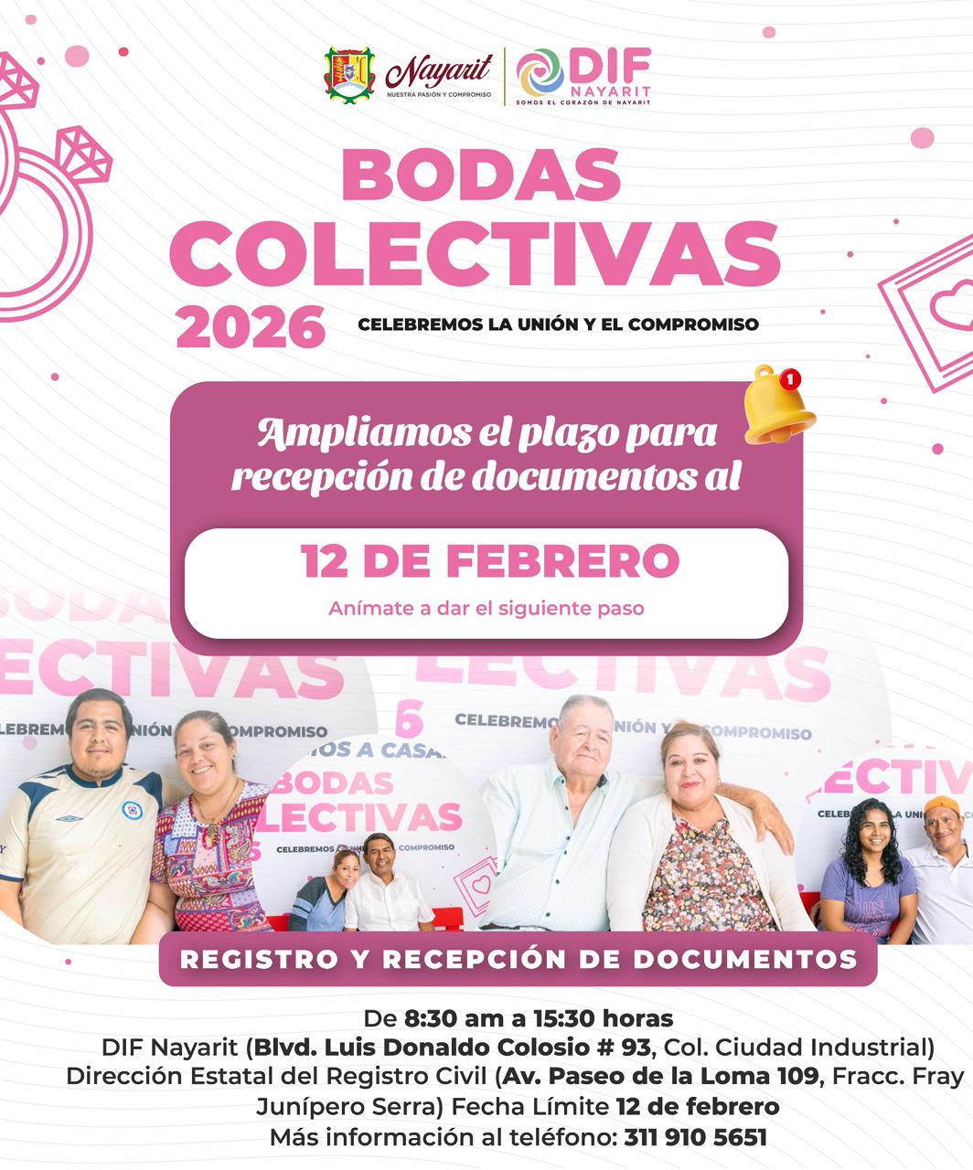 El Sistema DIF Nayarit informa que se amplió el plazo para el registro y recepción de documentos de las parejas que desean contraer matrimonio en las Bodas Colectivas 2026, el próximo 14 de febrero.