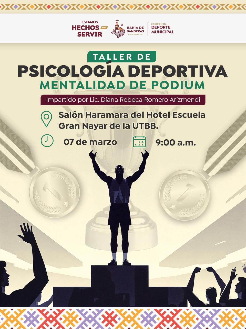 El Gobierno de Bahía de Banderas, encabezado por Héctor Santana, a través de la Dirección del Deporte Municipal, invita a deportistas del municipio a participar en el Taller de Psicología Deportiva “Mentalidad de Podio”, que se llevará a cabo el próximo 7 de marzo a las 9:00 de la mañana.