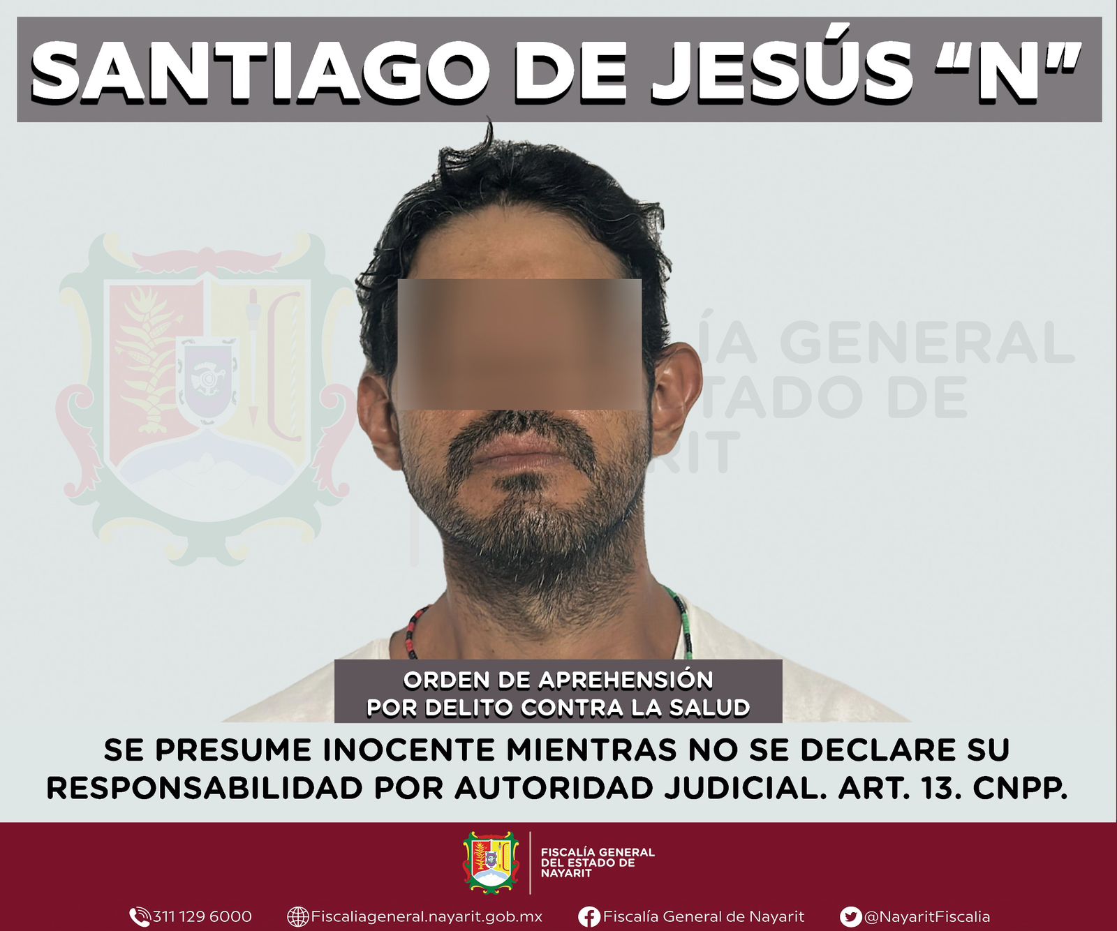 Elementos de la Agencia de Investigación Criminal de Nayarit ejecutaron una orden de aprehensión en la localidad El Tizate, municipio de Santiago Ixcuintla, contra Santiago de Jesús “N”, por su presunta participación en hechos que la ley tipifica como d3l1t0 c0ntr4 l4 s4lud en su modalidad de n4rc0m3nud30 —en su hipótesis de p0s3s10n d3 ps1c0tr0p1c0s—, cometido en agravio de la sociedad.