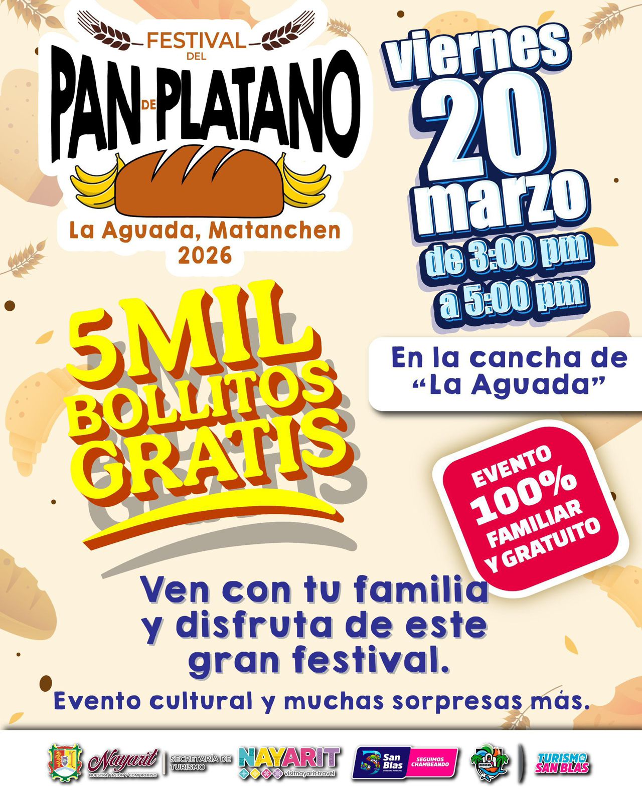 Mañana, viernes 20 de marzo, San Blas será sede del 1er Festival del Pan de Plátano, organizado por “Pepito Barajas”. El evento se realizará en La Aguada, Matanchen, en dos horarios: 3:00 pm y 5:00 pm.