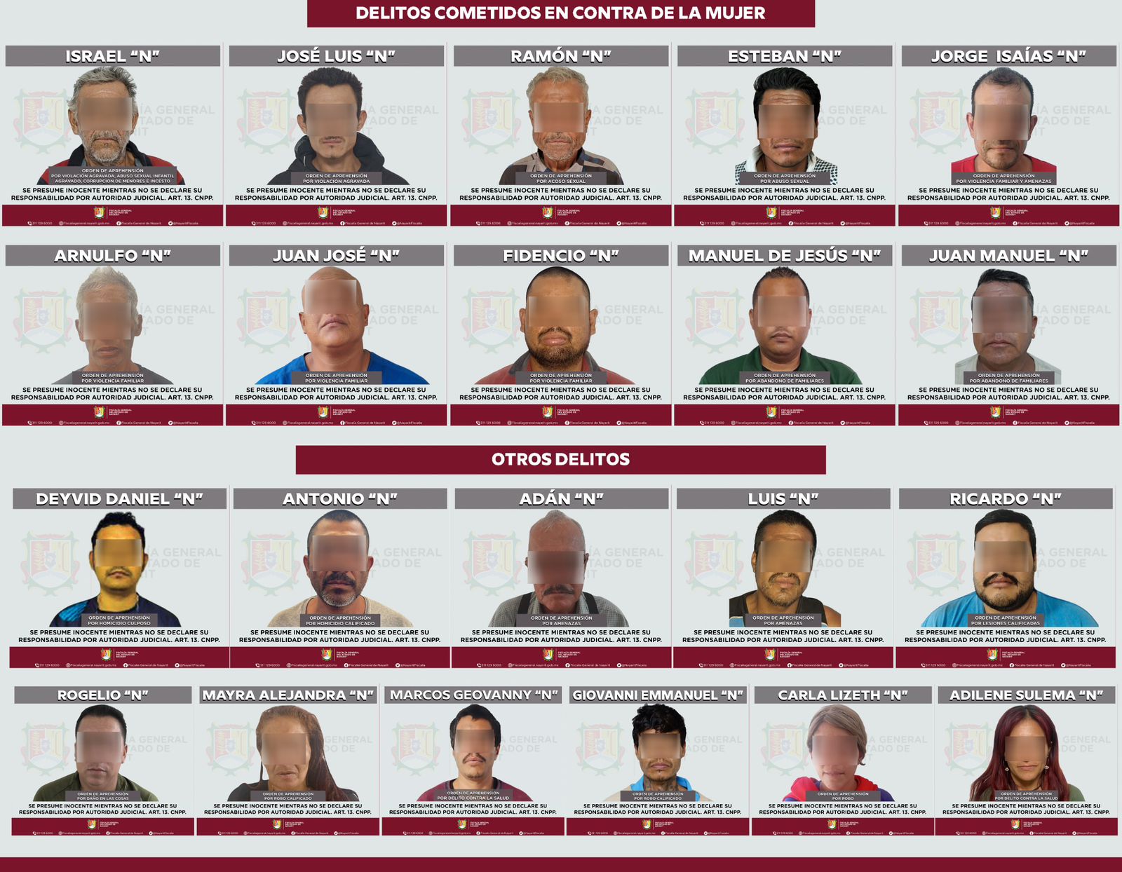 La Fiscalía General del Estado de Nayarit informó que, como parte de las acciones permanentes de investigación y persecución penal, del 21 al 23 de marzo se cumplimentaron 25 órdenes de aprehensión en distintos municipios de la entidad.