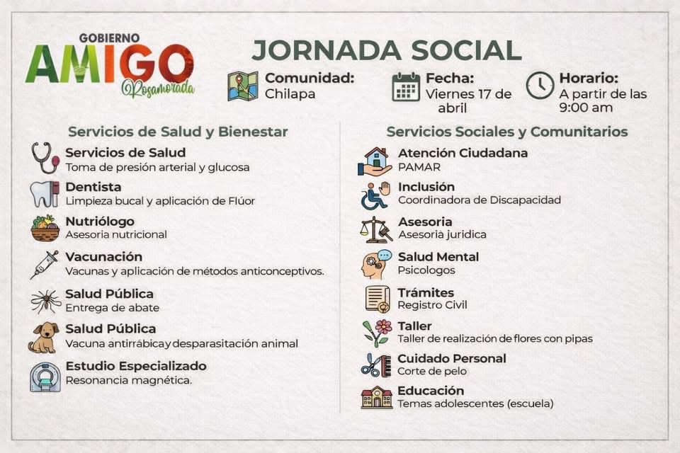 El Gobierno Municipal de Rosamorada, encabezado por Ampelio Gutiérrez, convocó a la población a participar en la Jornada Social que se realizará en la comunidad de Chilapa este viernes 17 de abril, a partir de las 9:00 horas.