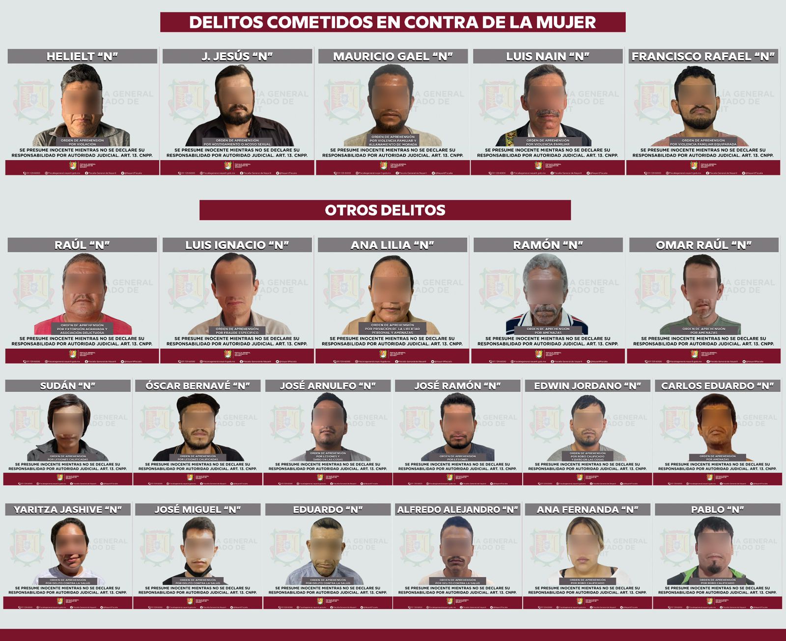 En seguimiento a las acciones de procuración de justicia, la Fiscalía General del Estado de Nayarit informó que del 17 al 19 de abril se cumplimentaron 24 órdenes de aprehensión por diversos delitos en distintos municipios del estado.
