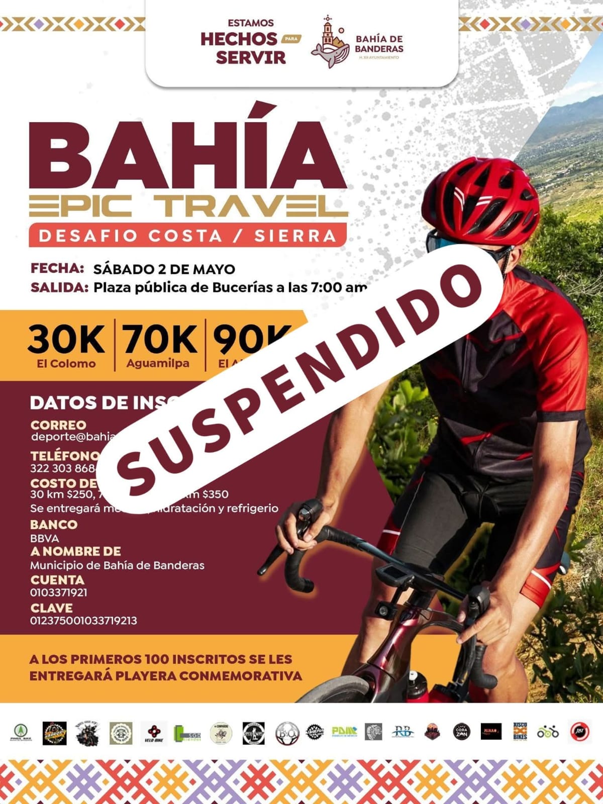 El Ayuntamiento de Bahía de Banderas, a través de la Dirección de Deporte Municipal, informa a la ciudadanía que el evento “Bahía Epic Travel (Desafío Costa/Sierra)” ha sido suspendido.