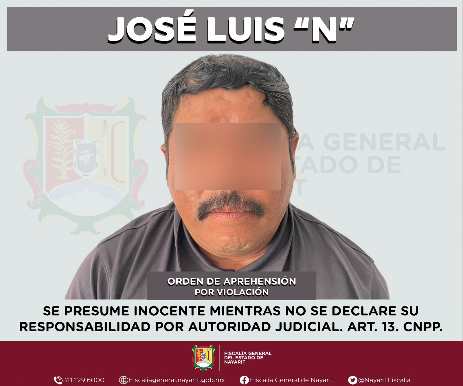 La Fiscalía General del Estado de Nayarit informó que elementos de la Agencia de Investigación Criminal cumplimentaron una orden de aprehensión en la ciudad de Tepic contra José Luis “N”, señalado por su presunta participación en el delito de v10l4c10n en agravio de una mujer, cuya identidad permanece reservada para proteger su privacidad e integridad.