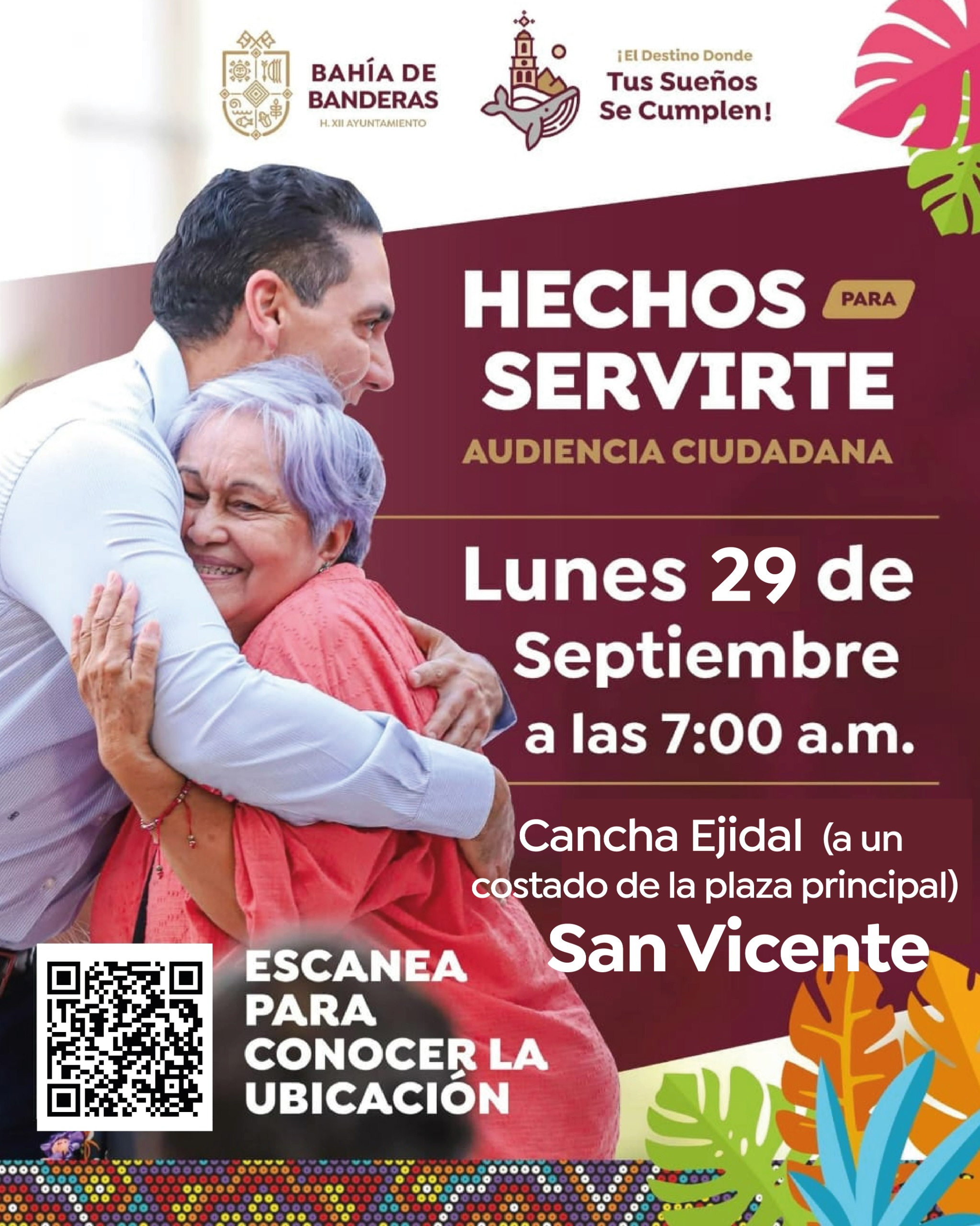 El Ayuntamiento de Bahía de Banderas, que encabeza el alcalde Héctor Santana, invita a la ciudadanía a la próxima Audiencia Ciudadana este próximo lunes 29 de septiembre en punto de las 7:00 a.m. en la Cancha Ejidal, junto a la plaza principal, en San Vicente.