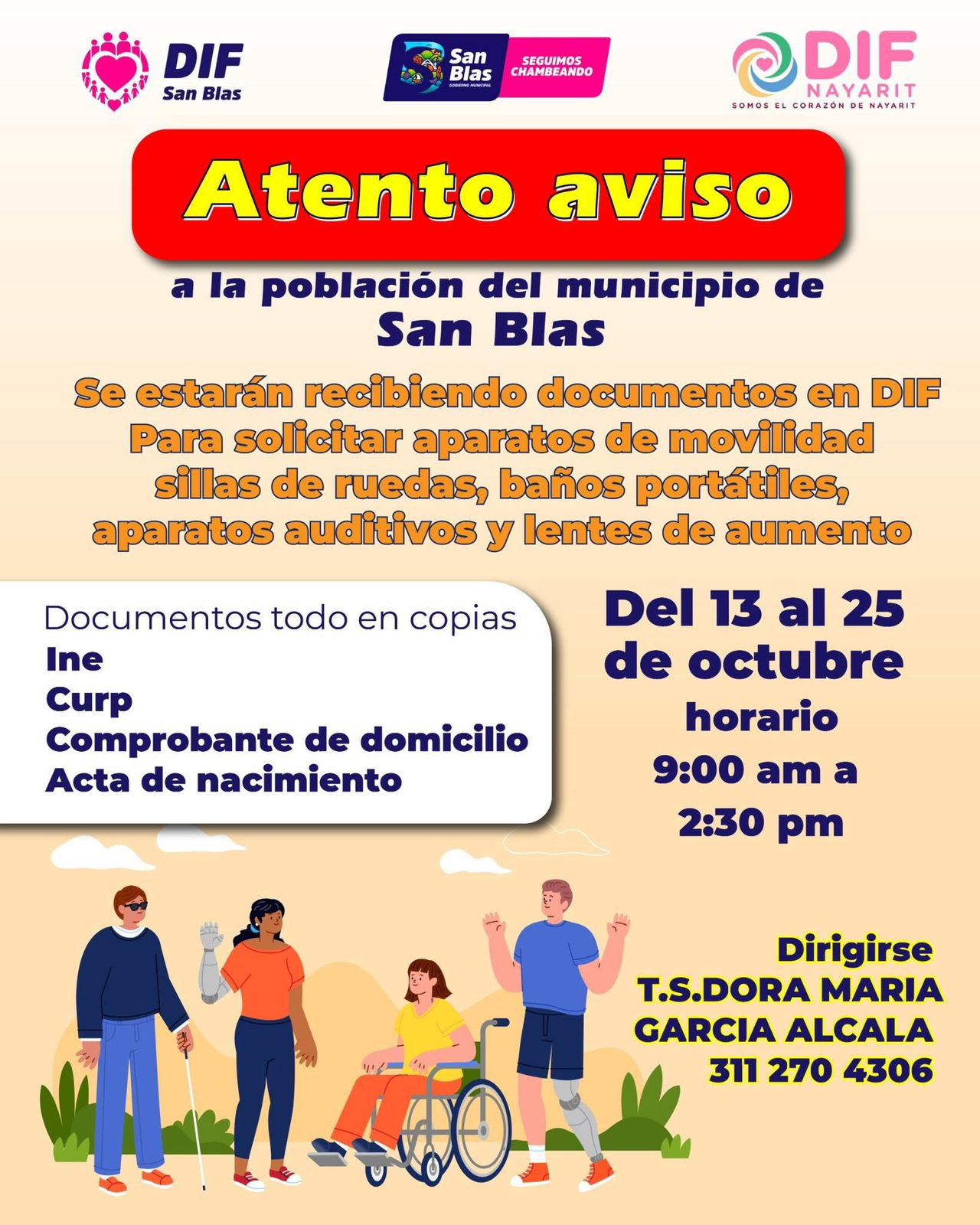 El presidente municipal de San Blas, José “Pepito” Barajas, a través del DIF Municipal, invita a la ciudadanía a aprovechar la campaña de recepción de documentos para solicitar aparatos de movilidad y apoyo funcional, tales como: