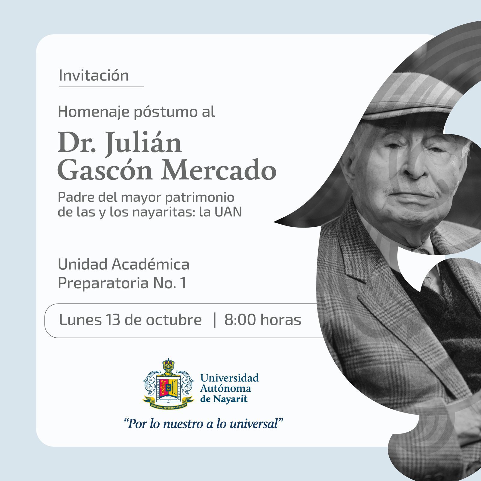 La Universidad Autónoma de Nayarit (UAN) hace una cordial invitación al homenaje póstumo en memoria del Dr. Julián Gascón Mercado, destacado nayarita y referente histórico de esta casa de estudios.