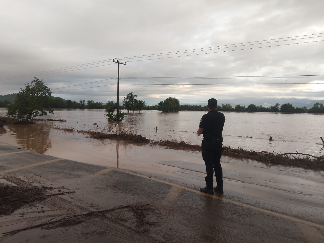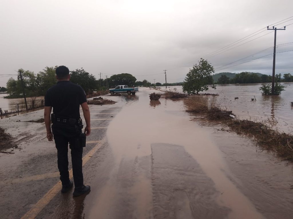 La Secretaría de Seguridad y Protección Ciudadana (SSPC), a través de la Policía Estatal destacamentada en Las Varas, municipio de Compostela, mantiene labores de vigilancia y monitoreo constante ante las inundaciones registradas en la carretera estatal, a la altura del crucero de Boca de Chila, ocasionadas por el desbordamiento del río Zacualpan.