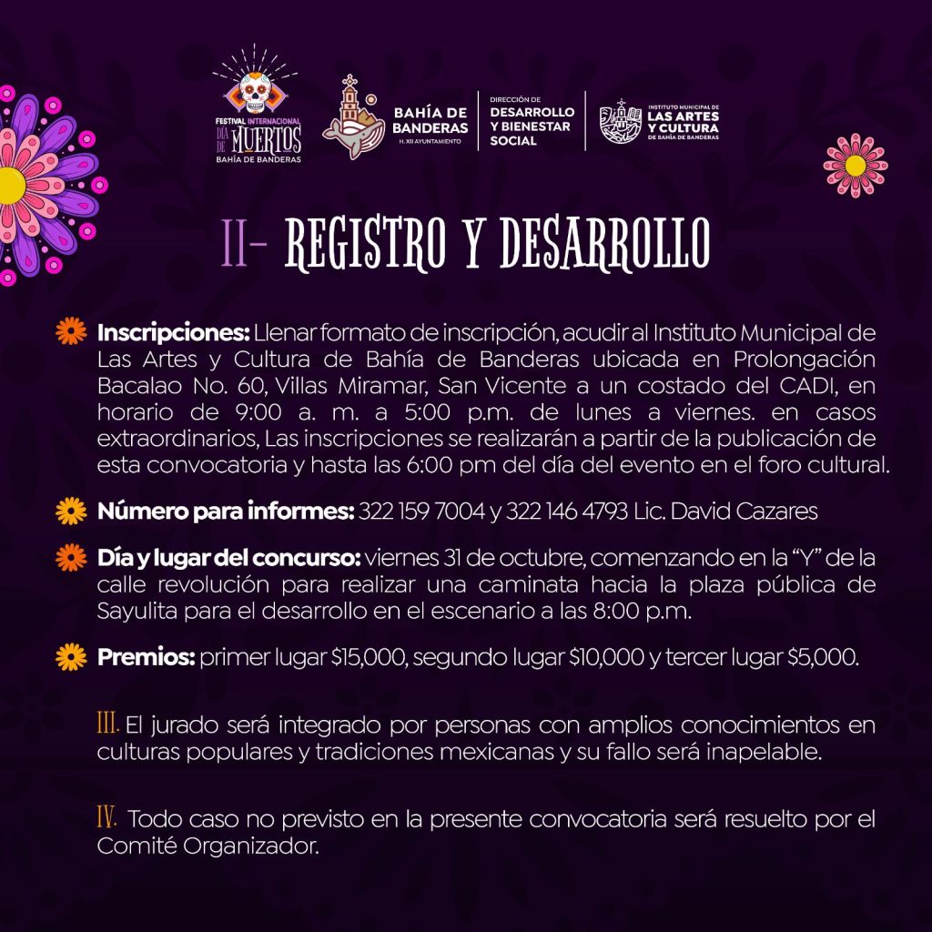 Las inscripciones estarán abiertas en las oficinas del Instituto Municipal de las Artes y Cultura de Bahía de Banderas, ubicadas en San Vicente, de lunes a viernes en horario de 9:00 a.m. a 5:00 p.m., y el día del evento en el foro cultural.