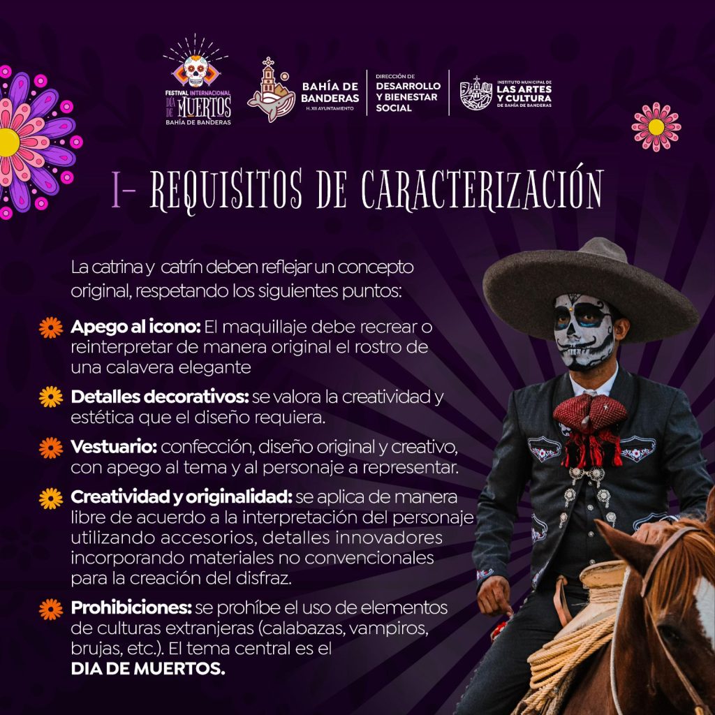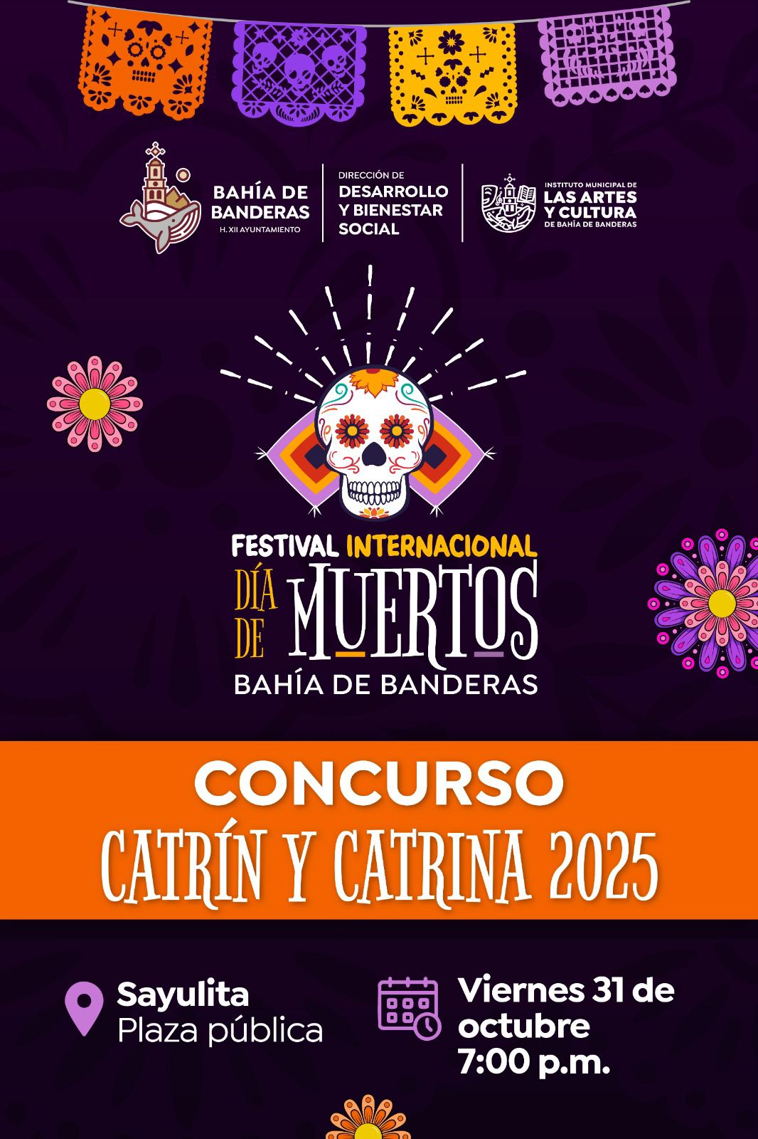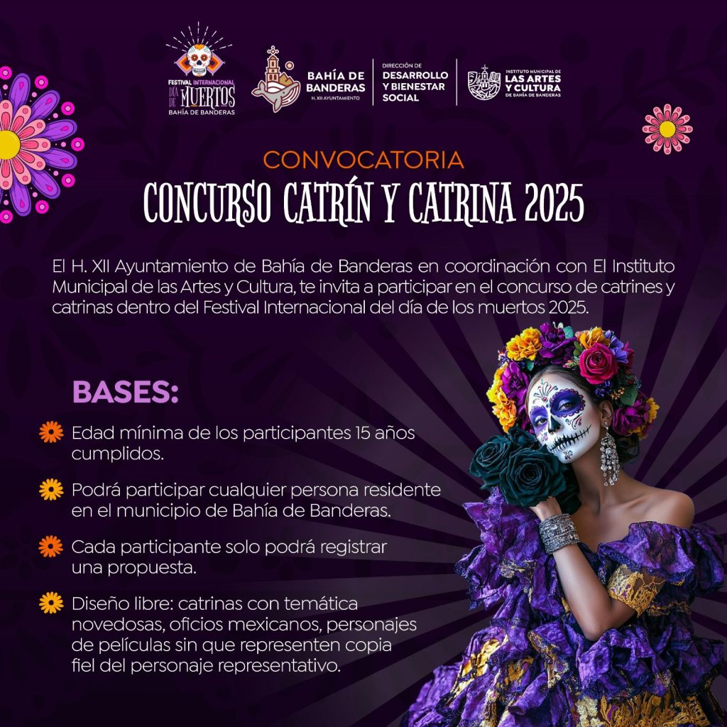 En el marco del Festival Internacional del Día de Muertos Bahía de Banderas 2025, el Ayuntamiento, que encabeza el alcalde Héctor Santana, a través del Instituto Municipal de las Artes y Cultura, en coordinación con la Dirección de Desarrollo y Bienestar Social, lanzó la convocatoria para participar en el Concurso de Catrín y Catrina 2025, que se llevará a cabo el próximo viernes 31 de octubre a las 7:00 p.m. en la plaza pública de Sayulita.