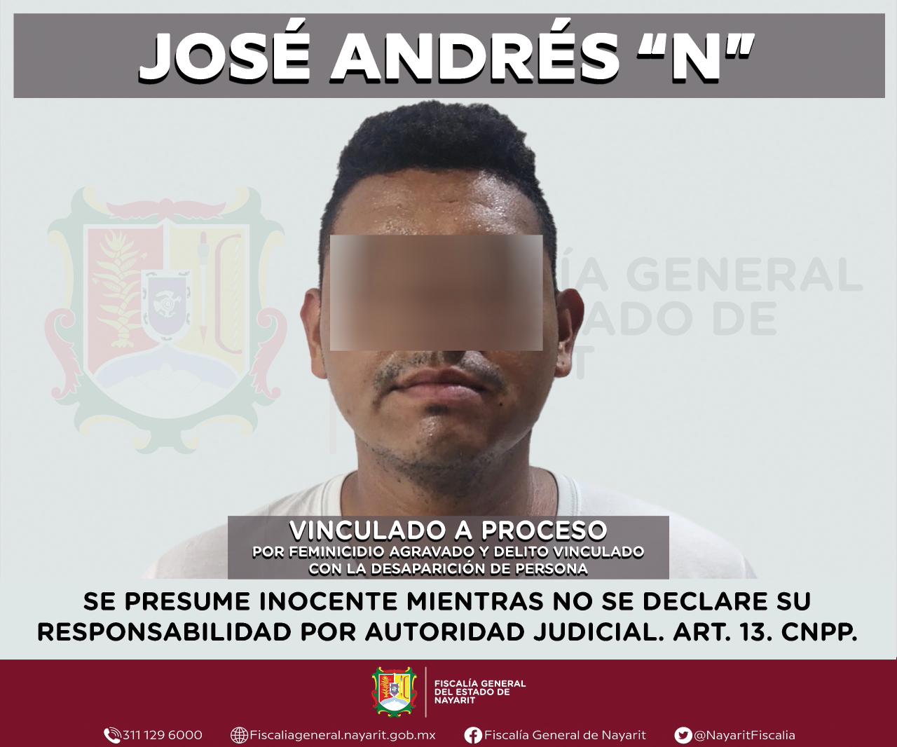 La Fiscalía General del estado de Nayarit informa que un Juez de Control dictó auto de vinculación a proceso contra José Andrés “N”, por su probable responsabilidad en los del1t0s de femin1c1d10 agravado y del1t0 vinculado con la desapar1ción de persona, conforme a lo previsto y sancionado en el Código Penal del Estado de Nayarit.