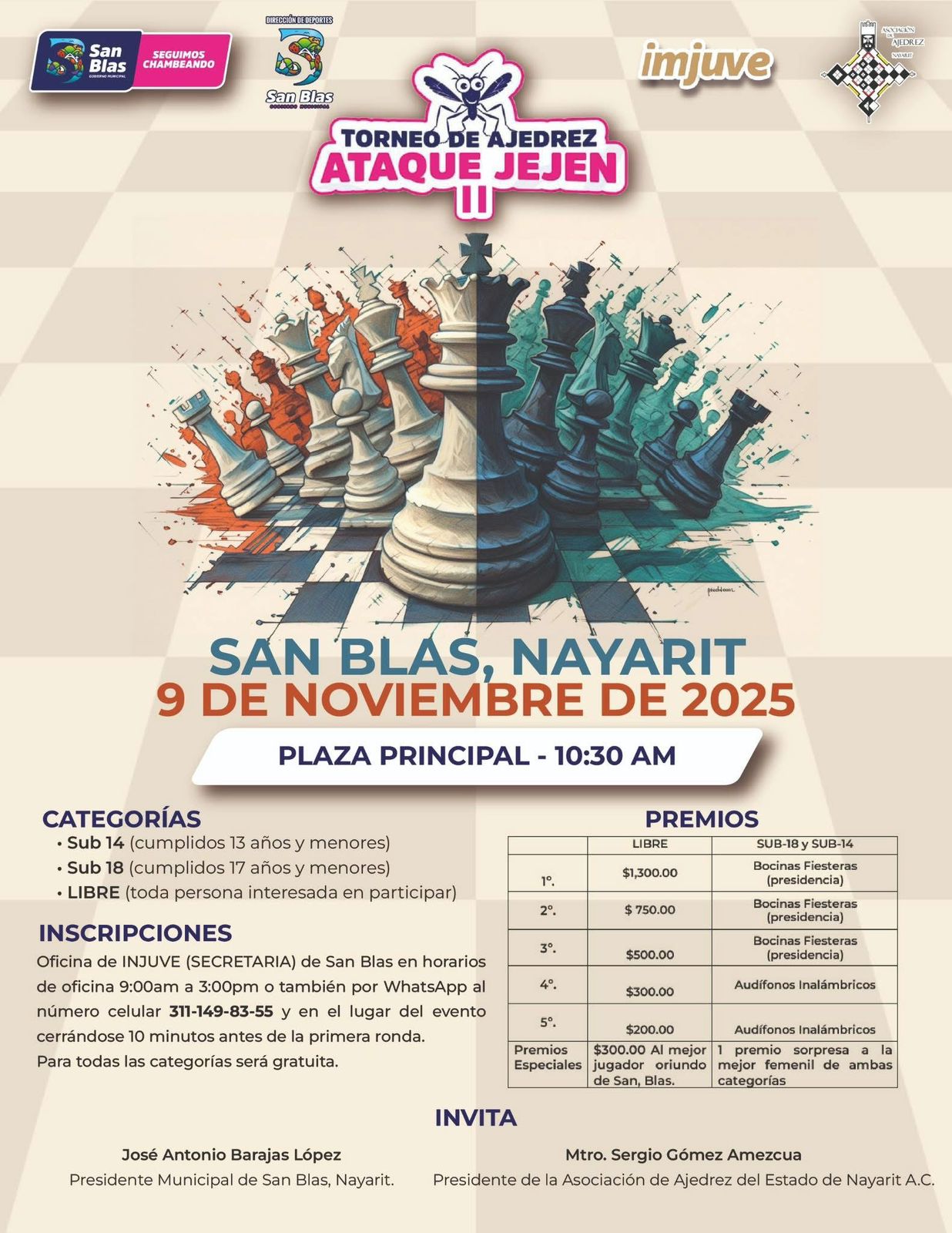 El Gobierno Municipal de San Blas, encabezado por José Antonio Barajas López, en coordinación con la Asociación de Ajedrez del Estado de Nayarit, el Instituto Municipal de la Juventud (IMJUVE) y la Dirección de Deportes Municipal, convocan a la comunidad a participar en el Torneo de Ajedrez “Ataque Jejen II”.