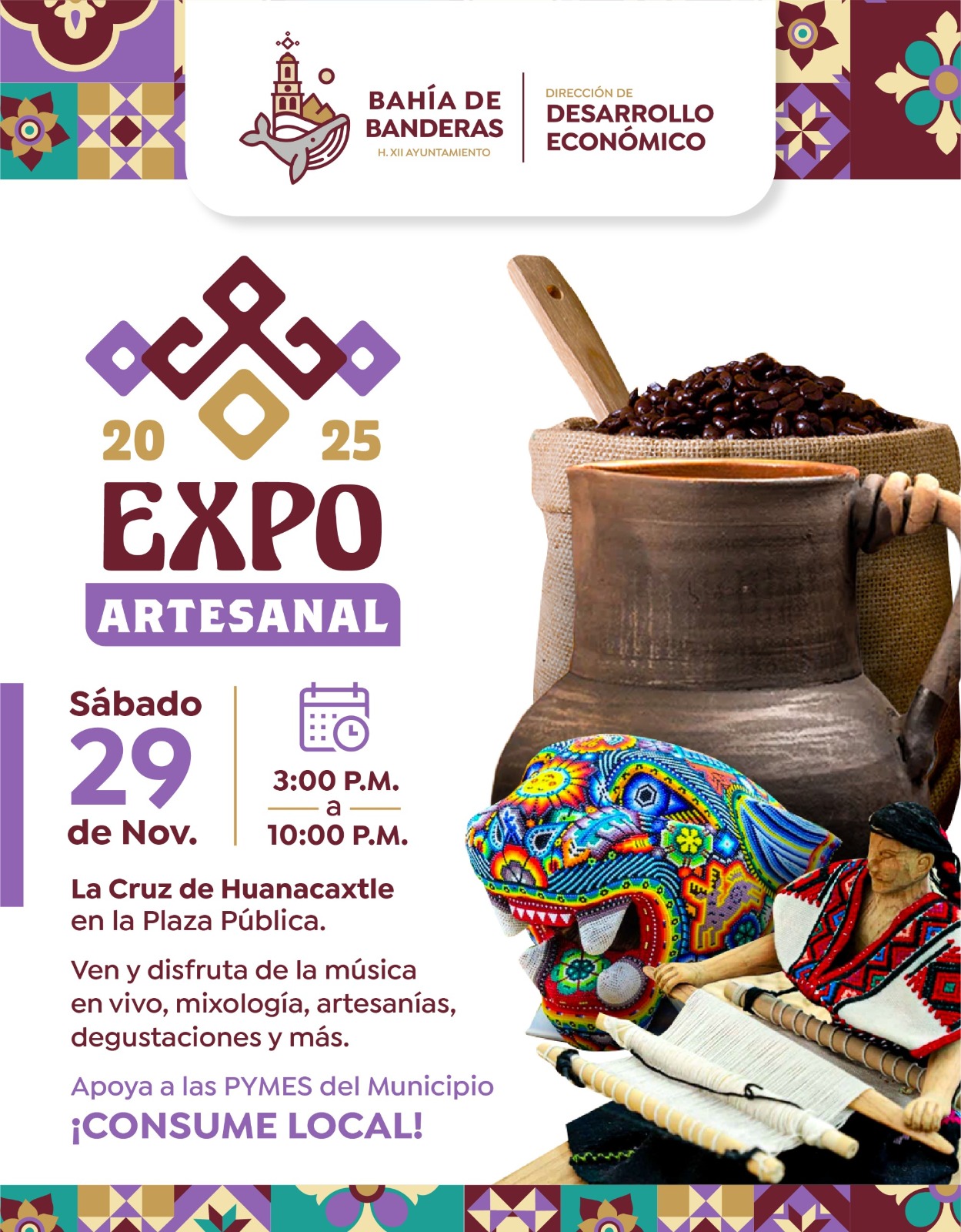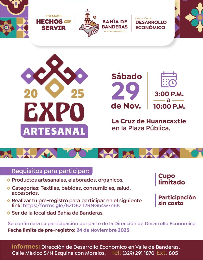 El Gobierno Municipal de Bahía de Banderas, encabezado por el presidente municipal Héctor Santana, a través de la Dirección de Desarrollo Económico, anuncia la realización de la Expo Artesanal 2025, que se llevará a cabo el sábado 29 de noviembre, en un horario de 3:00 p.m. a 10:00 p.m., en la Plaza Pública de La Cruz de Huanacaxtle.