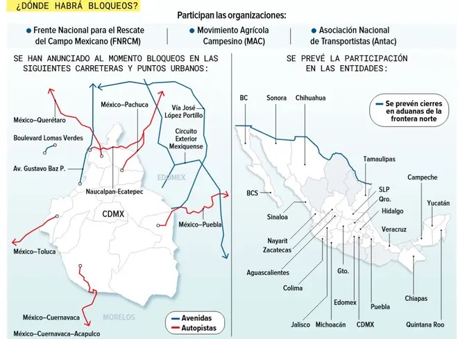 Los puntos de bloqueo confirmados incluyen el Valle de México, donde se verán afectadas varias autopistas. También habrá cierres en la autopista Naucalpan–Ecatepec, la vía José López Portillo, la avenida Gustavo Baz Prada, el Circuito Exterior Mexiquense y el bulevar Lomas Verdes.