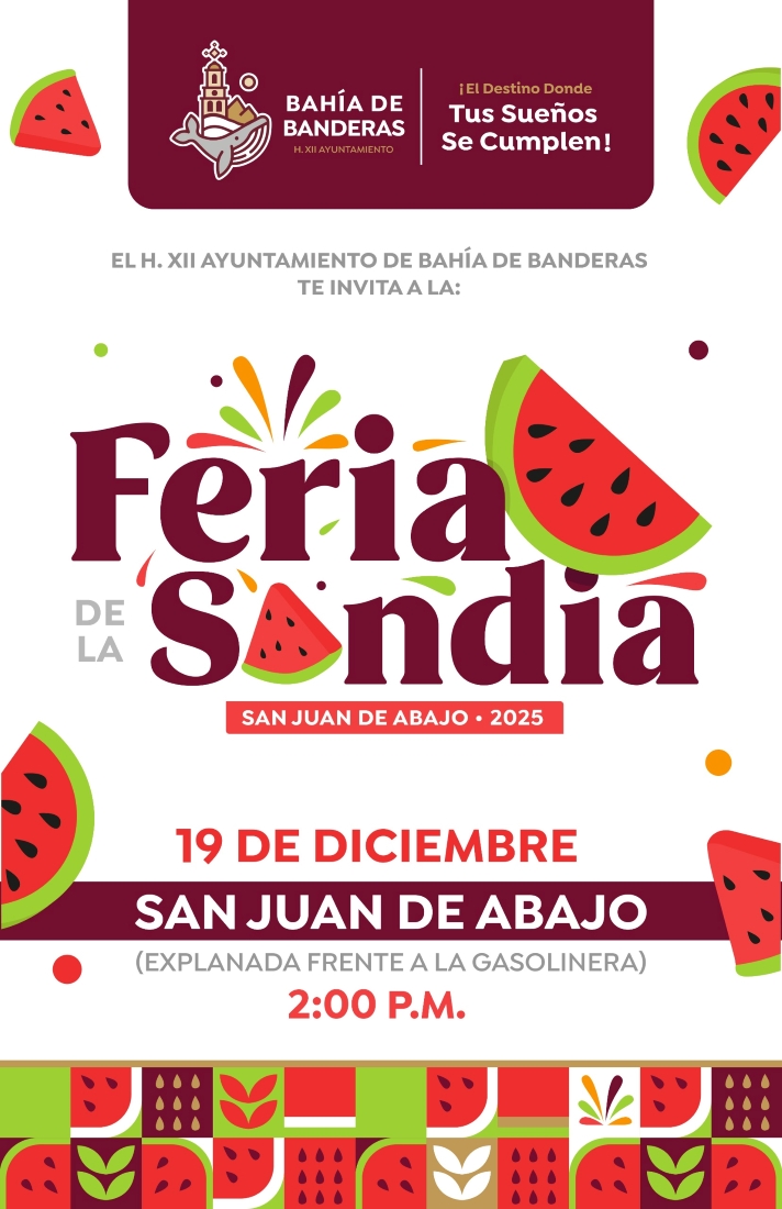 El Ayuntamiento de Bahía de Banderas, encabezado por Héctor Santana, invita a la ciudadanía a participar en la Feria de la Sandía San Juan de Abajo 2025, un evento que celebra la identidad agrícola y la convivencia familiar.
