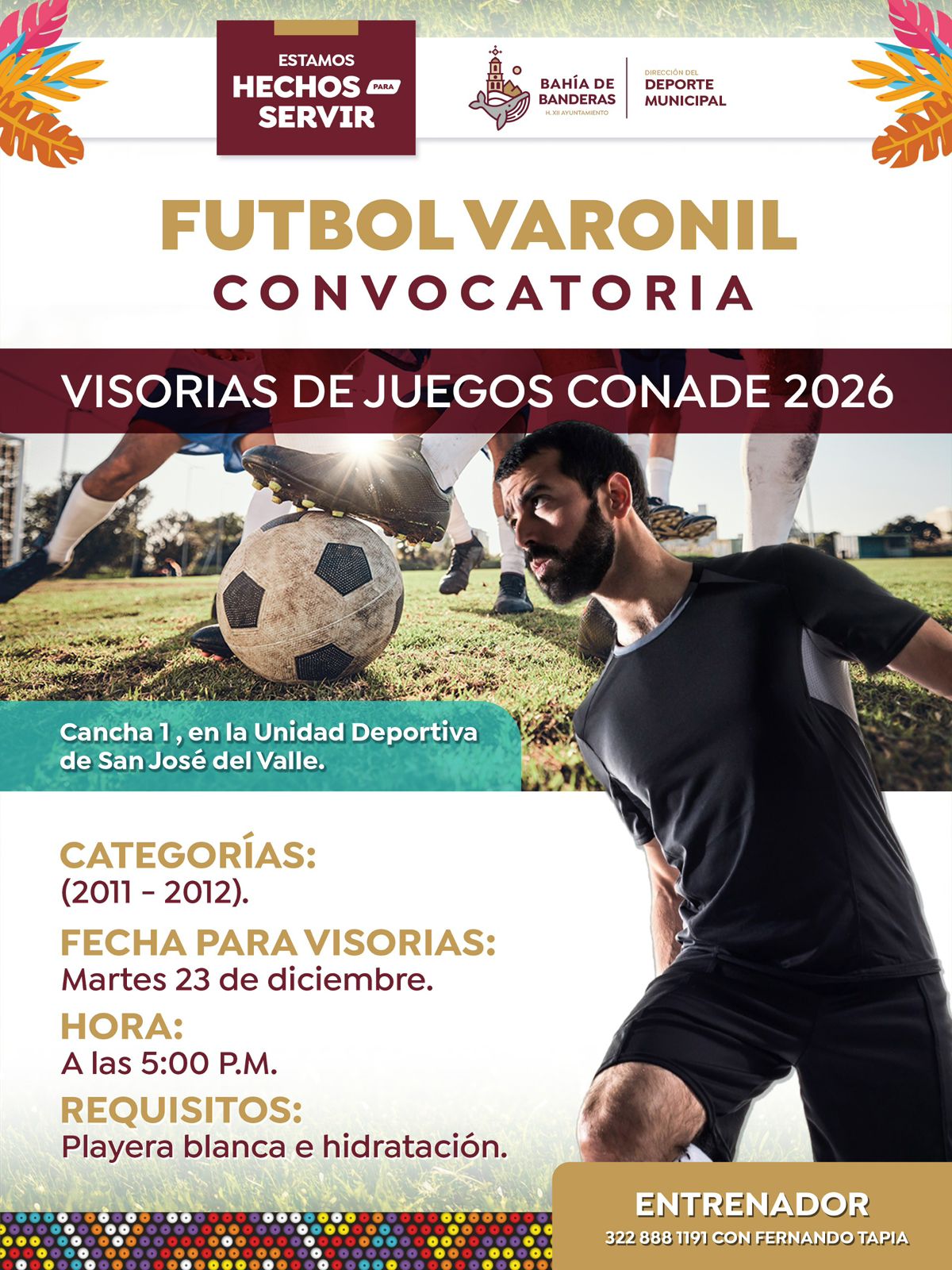 La Dirección del Deporte Municipal de Bahía de Banderas invita a los jóvenes futbolistas del municipio a participar en las visorias de futbol varonil rumbo a los Juegos CONADE 2026, dirigidas a jugadores nacidos en los años 2011 y 2012.