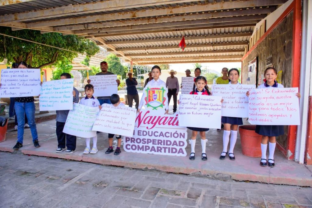 Con el propósito de mejorar las condiciones en las que estudian las niñas y niños en la entidad, el gobernador Miguel Ángel Navarro Quintero, acompañado de su esposa, la presidenta del Sistema DIF Nayarit, doctora Beatriz Estrada Martínez, entregó la techumbre de la cancha de usos múltiples en la Primaria Emiliano Zapata, ubicada en la localidad de El Borbollón, municipio de Compostela.