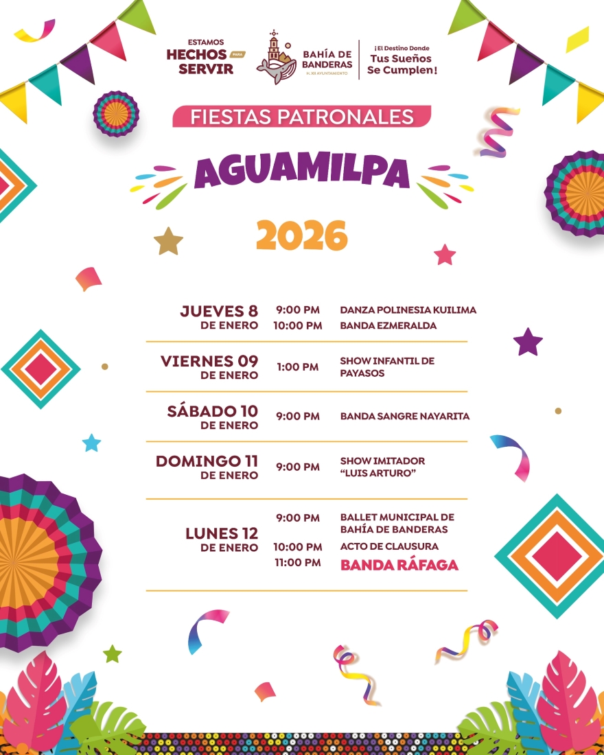 El Ayuntamiento de Bahía de Banderas, que encabeza el presidente municipal Héctor Santana, invita a la ciudadanía para asistir a las Fiestas Patronales Aguamilpa 2026, mismas que se celebrarán del 8 al 12 de enero con un programa de actividades culturales y artísticas.