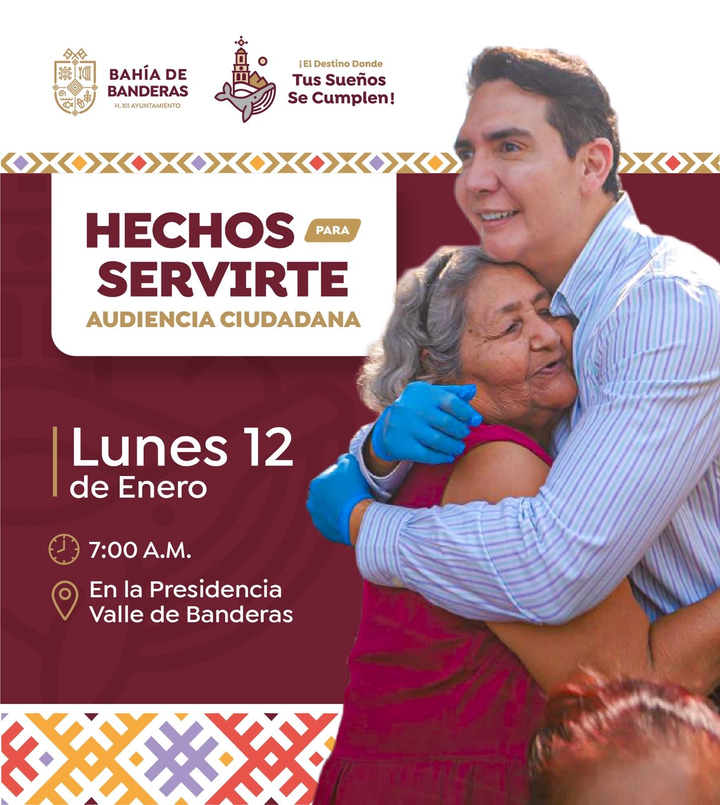 La jornada se realizará este lunes 12 de enero a las 7:00 a.m., en las instalaciones de la Presidencia Municipal de Valle de Banderas, donde se invita a toda la ciudadanía a participar, plantear inquietudes y presentar propuestas para fortalecer el desarrollo del municipio.